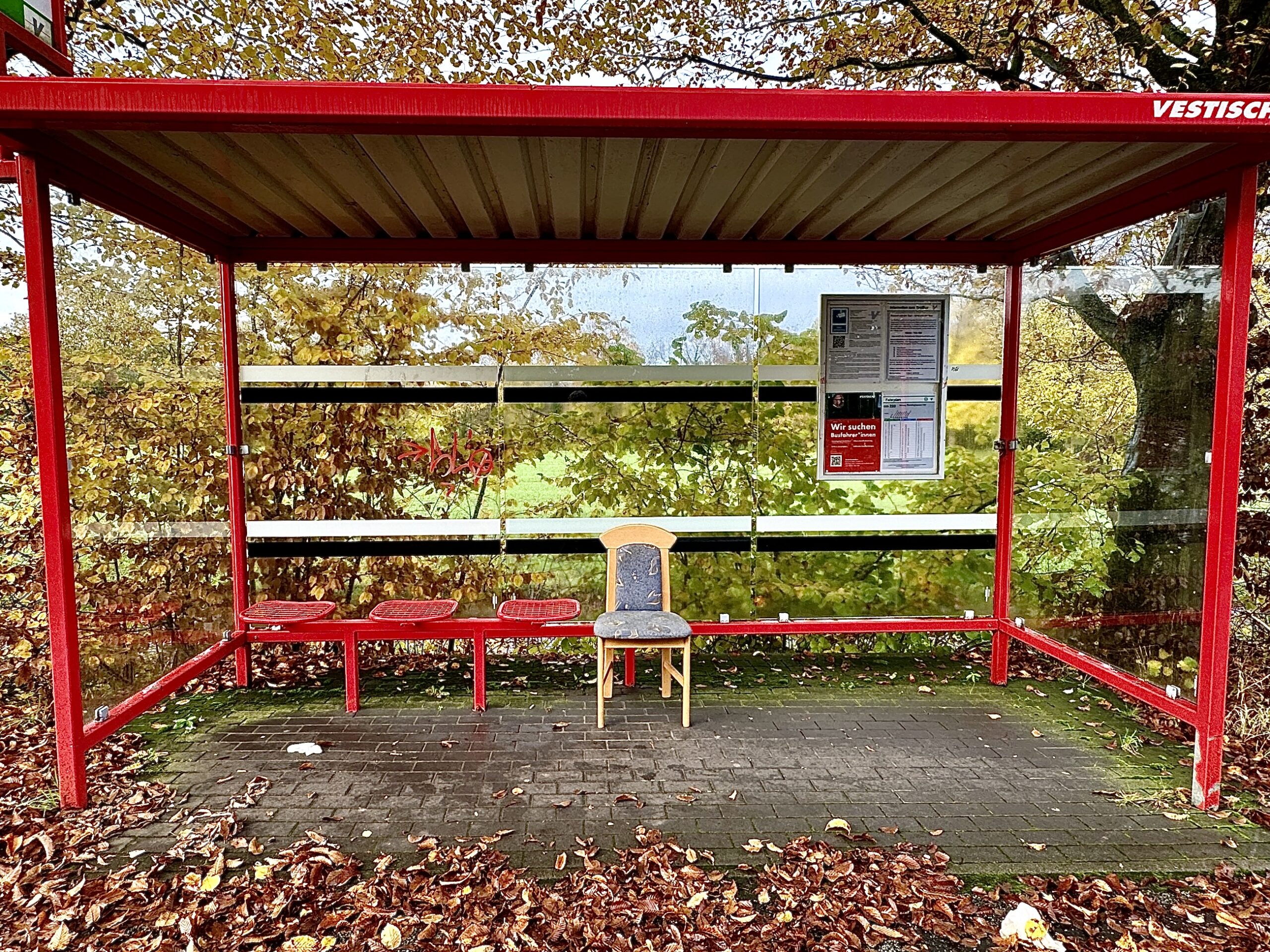 Deine Bushaltestelle auf dem Bild macht einen ziemlich gemütlichen Eindruck. :–)