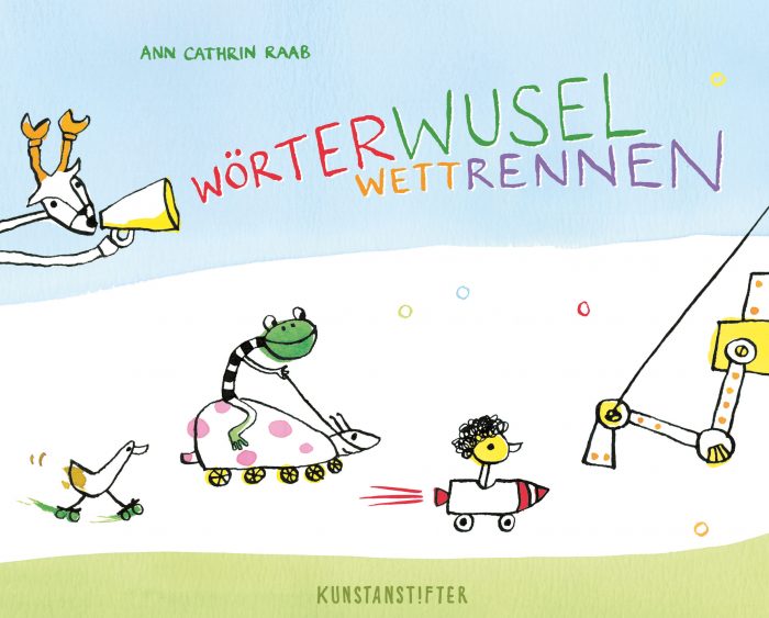 Ann Cathrin Raab, Wörterwuselwettrennen, hardcover mit vier Aufklappseiten, Kunstanstifter Verlag, Mannheim 2019, 40 S., ISBN 978-3-942795-78-4