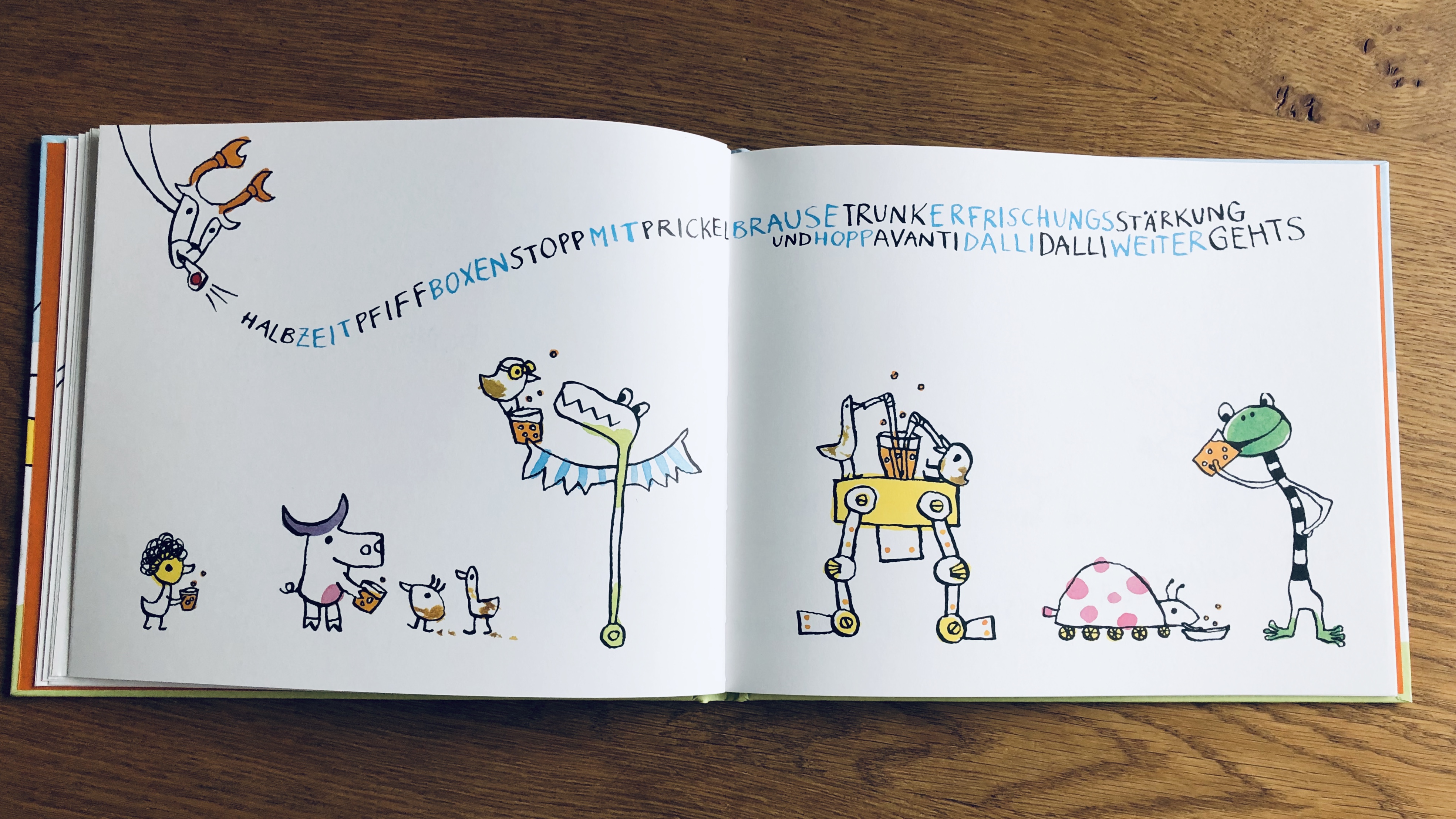 Kennzeichnend für dieses „Wörterwuselwettrennen“-Bilderbuch sind zahlreiche Wortungetüme, kaum lesbar, wenn die einzelnen Wortteile nicht farbig voneinander abgegrenzt wären:
